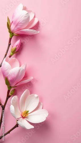 Pastel pink backdrop, delicate magnolia blossoms arranged flat lay , flatlay, design, cream