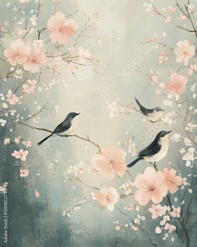 Pastel Pink Blossoms and Three Birds on Branches