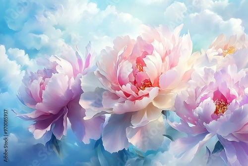 peony, flower, blossom, bloom, floral, pink flower, spring, nature, romantic, beautiful, delicate, feminine, soft, white, blue skies, sky, background, macro, closeup, garden, floral background, pastel, summer, botany, floral arrangement, bouquet, flower petals, light, beauty, artistic, dreamy, vibrant, fresh, wallpaper, artwork, botanical