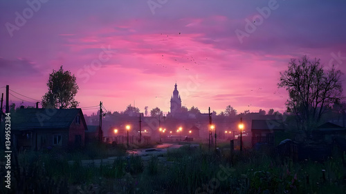 sunset, city, pink, purple, twilight, village, tree, house, street light, calm, peaceful, idylli, night, dawn, sky, cloud, building, town, evening, landscape, nature, outdoors, rural, pixelated, artistic, digital artwork, illustration, fantasy, vintage, retro, no people, magenta, orange, light, warm colors, golden hour, small town, fog, mist, river, water, grass, field, lamp-post, quiet