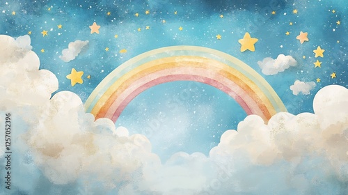 rainbow, cloud, star, night, sky, pastel, watercolor, illustration, dreamy, magical, fantasy, childlike, whimsical, cute, sweet, colourful, vibrant, bright, soft, gentle, peaceful, serene, happy, joyful, background, artwork, painting, art, design, texture, pattern, aethereal, celestial, cosmic, nebula, galaxy, light, shine, sparkle, glistering, fluffy, cotton, airy, dream, wonder, hope, innocence, purity
