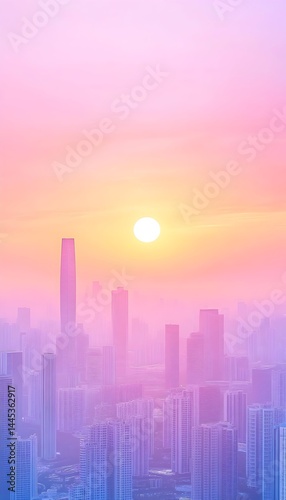 sunrise, sunset, city landscape, city, building, skyscraper, haze, fog, mist, pastel, pink, orange, yellow, sky, horizon, soft, light, dreamy, aethereal, calm, serene, peaceful, tranquil, beautiful, vibrant, colourful, urban, architecture, modern, contemporary, tower, silhouette, sun, bright, glow, warmth, atmosphere, mood, abstract, artistic, illustration, graphic, design, image, photo, view, perspective, aerial, high