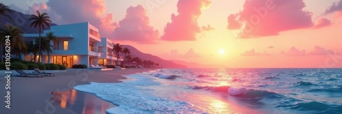 Pastel sunrise over Art Deco buildings, ocean hues , photo, clouds, beautiful