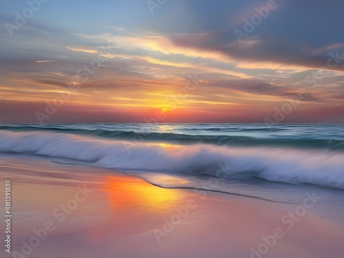 sea, beach, painting, art, sunset, sunrise, sun, ocean, sky, nature, landscape, cloud, sand, coast, dawn, wave
