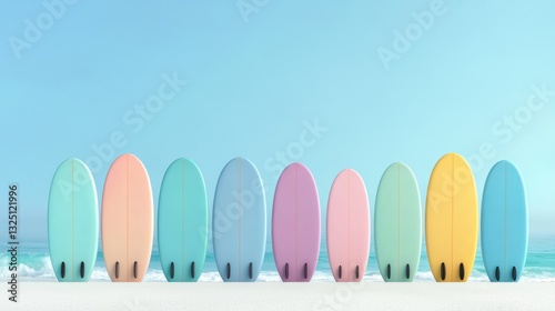 Pastel Surfboards on Sandy Beach with Ocean View - Summer Holiday Concept