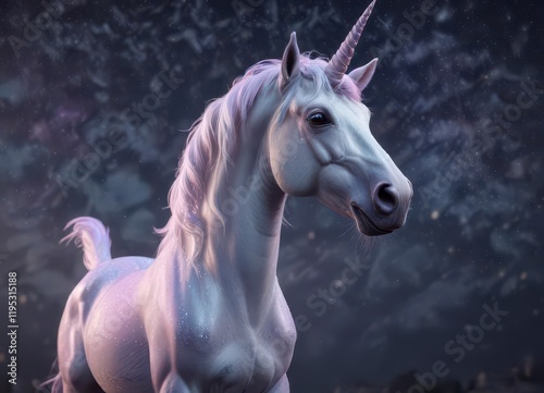 Pastel unicorn with a sparkly horn, standing in front of starry night sky, fantasy, stars, magic