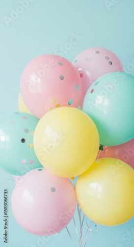 Pastel-colored balloons with silver confetti, arranged in a cluster against a light-blue background, suggesting celebration or festive mood