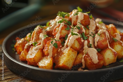 tapas, potato, spicey, garnish, food, meal, dish, dinner, cookery, vegetable, delicious, sauce, lunch, vegetable, epicure, cooked, healthy, roasted, hot, green, red
