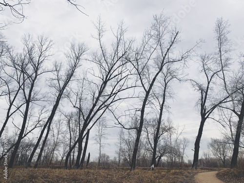Pathway in the empty park, leafless trees, melancholic atmosphere