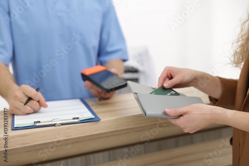 Patient taking credit card out of wallet and receptionist with terminal at counter, selective focus