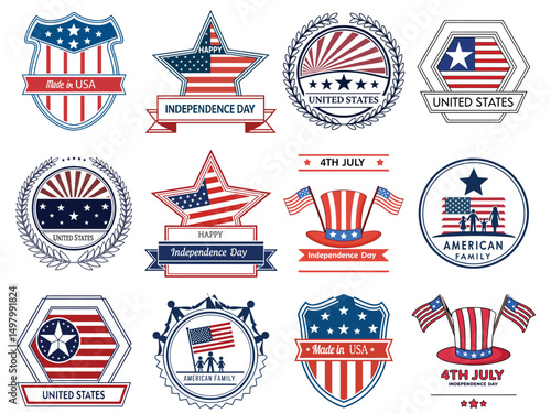 Patriotic American Independence Day Badges and Logos Vector Illustration