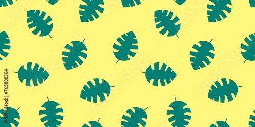 Pattern Leaf Silhouette Monstera. Doodle style. Seamless print exotic Plant yellow background. Green Botany, herbs. Evergreen liana. Tropical summer. Vibrant Color Image. Symmetry. Vector illustration