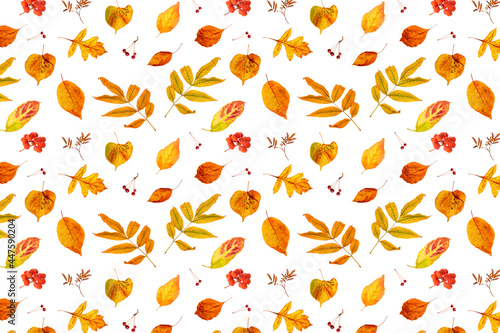 Pattern of natural orange autumn leaves and berry on a white background, as a backdrop or texture. Fall wallpaper for your design. Top view Flat lay