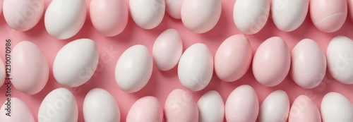 Pattern of pastel pink and white Easter eggs against a pink backdrop, colorful designs, decorative arrangement, patterned eggs