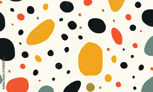 Pattern of Small, Rounded Shapes in Black and White With Pops of Color Like Green or Orange on an Off-White Background. It Features a Mix of Large and Medium-Sized Dots for Visual Interest