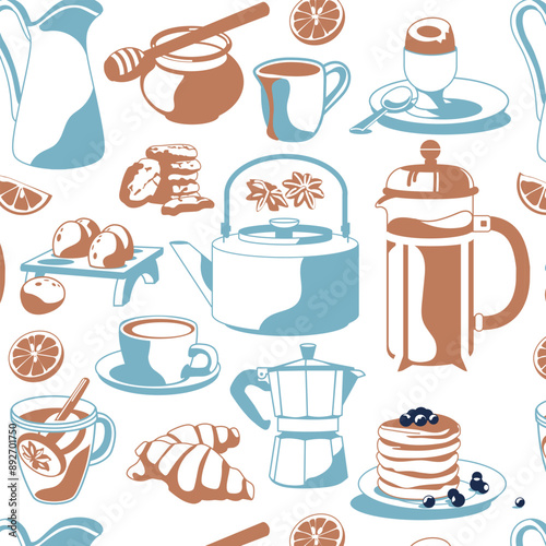 Pattern of traditional breakfast. Blue and brown colors. Vector flat illustration. Cafe and restaurant menu.