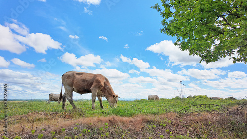 animal, farm, meadow, nature, field, cow, pasture, meadow, landscape, heaven, green, mammal, rural, agriculture, summer, blue, feed, countryside, cattle, outside