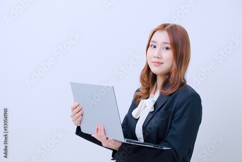woman, personal computer, ol, office worker, notebook, gentle, student, working, career woman, finance, bright, business, presentation, paperwork, work, young, sideline, investment, idea, uniform, waist, copy space, vest, future, planning, money, finance, bank, people, portrait, white background, model, beauty, employee, stand