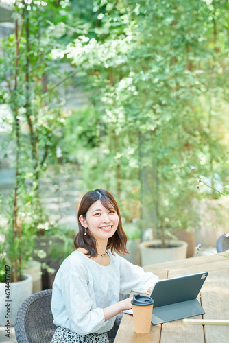business, woman, career woman, freelance, open air, work, notebook, lifestyle, mail, telecommuting, designer, secretary, personal computer, japanese, work, working, asian, employee, personal computer, town, sideline, student, cyberspace, plenitude, smile, corner, refresh, relax, study, break, casual, table