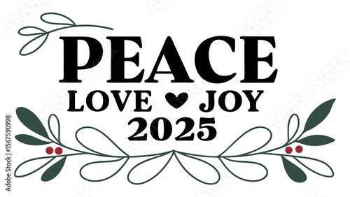 peace, love, joy, 2025, new year, holiday, christmas, greeting, wish, celebration, festive, decoration, typography, text, message, seasonal, winter, hope, happiness, positive, sentiment, floral, leaf, tree branch, greenery, berry, red, green, black, white background, isolated, design, graphic, illustration, vector