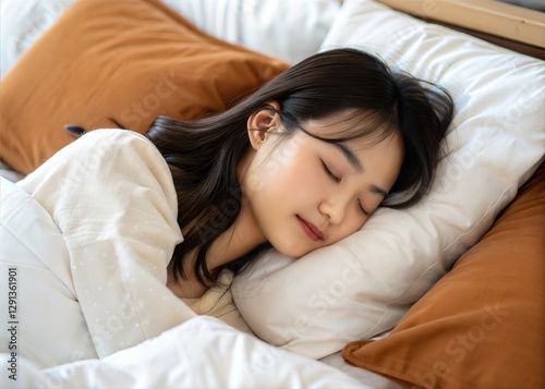 asian woman, sleeping, peaceful, serene, relaxed, restful, bedchamber, bed, bedding, pillow, white, terracotta, comfortable, calmness, wellness, sleep, night, daytime, interior, home, lifestyle, asian, beauty, missy, fashion, soft, calm, tranquil, rest, nap, pillow, coverlet, linen, natural light, portrait, closeup, horizontal, woman, lying, morning, people, person, 1, resting, relaxation, dream, relax
