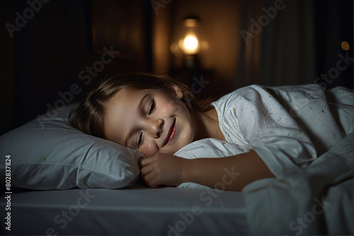Peaceful bedroom atmosphere, a child sleeps in bed under the warm light of a night lamp