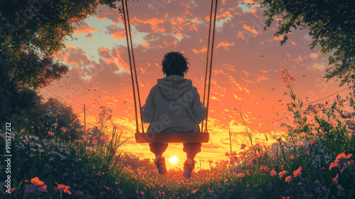 Peaceful Boy Sitting on Swing in Wildflower Garden at Sunset - Lofi Anime Illustration