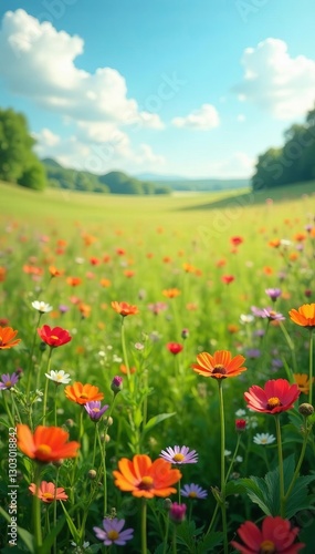 Peaceful field with blooming wildflowers under bright sky, spring, bright sky