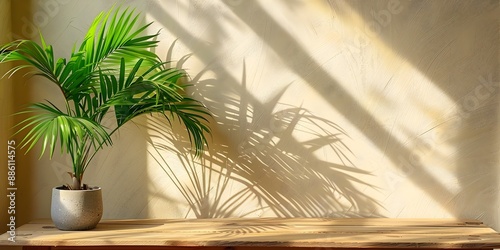 Peaceful Indoor Tropical Plant and Wooden Table Display with Inviting Shadows on Wall