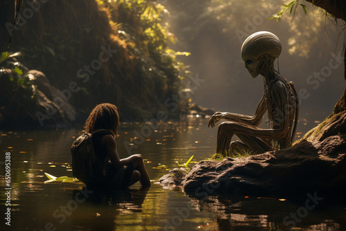 alien, human, curiosity, wonder, communication, exploration, encounter, harmony, nature, universe, discovery, awe, calmness, friendship, cosmic, adventure, interstellar, oneness, connection, serenity, peace, natural beauty, collaboration