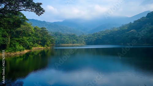 Peaceful lake surrounded by mountains and vibrant greenery high resolution picture
