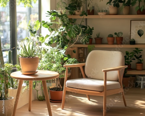 Peaceful Living Room Corner with Indoor Plants and Wooden Furniture