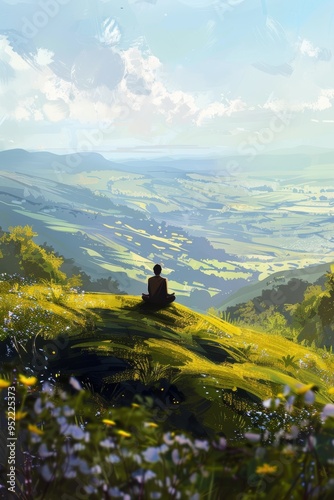 meditation, hilltop, serene, vale, panoramic, tranquil, nature, peaceful, mindfulness, sunlight, wildflower, rolling hills, scenery, landscape, solitude, harmony, relaxation, retreat, calm, yoga, outdoors, countryside, meditative, spiritual, scenic, horizon, vista, contemplation, natural beauty, zen, stillness, environment, greenery, inspirational, elevation, openness, wellness, field, daybreak, blissful, traveler, escape, perspective
