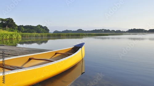 Peaceful morning scene with a yellow canoe docked at a lakeside pier.