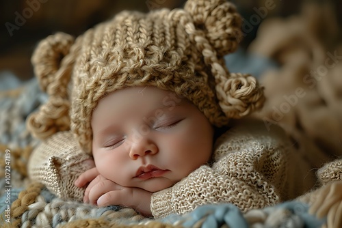 Peaceful newborn portrait with handmade beige knit hat and blanket in gentle natural light. Perfect for nursery decor, baby albums and maternity services.