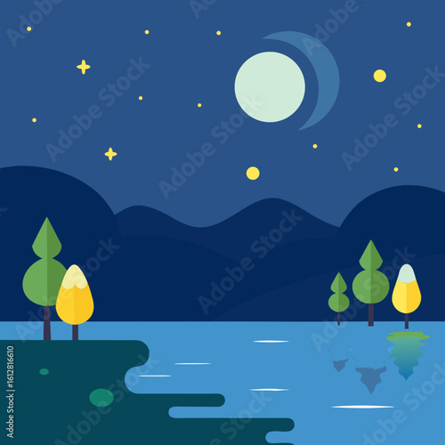 night, landscape, moon, star, crescent, sky, dark, blue, water, lake, river, tree, mountain, hill, flat, design, illustration, vector, minimalist, calm, peaceful, serene, nature, scenic, yellow, dot, green, abstract