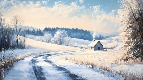 Peaceful Rustic Winter Landscape with Cozy Cottage