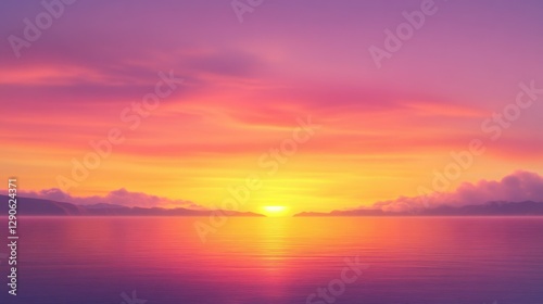 Peaceful scene of sunset over the ocean, with clouds and mountains in the distance.