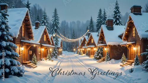 Peaceful snowy cabins under a clear, starry winter sky. Retro Christmas postcard