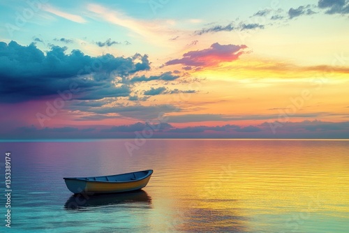 Peaceful sunset, boat on calm sea, dramatic clouds