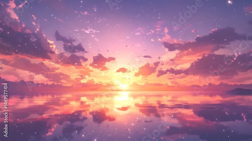 sunset, ocean, sunrise, sky, cloud, water, calm, peaceful, tranquil, serene, beautiful, nature, landscape, background, scenery, evening, morning, twilight, horizon, sea, artwork, illustration, digital artwork, vibrant, colourful, romantic, dreamy, magical, fantasy, pastel, pink, purple, orange, golden hour, light, star, glistering, innovation, abstract, education, dynamic
