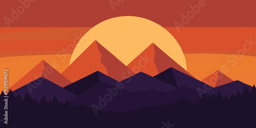 sunset, landscape, mountain, sky, background, nature, scenery, art, vector, illustration, design, graphic, view, horizon, light, glow, dusk, peaceful, tranquil, serene, summer, warm, cliff, ridge, range, alpine, peak, ray, red, orange, yellow, cloud, shadow, hand, drawn