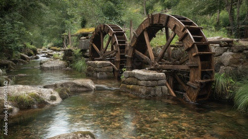 Peaceful Water Wheel in Tranquil Stream Surrounded by Lush Greenery and Natural Stones