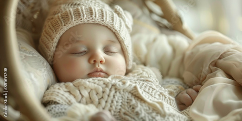 Peacefully sleeping baby wearing a knitted hat and sweater, nestled comfortably in a cozy blanket.