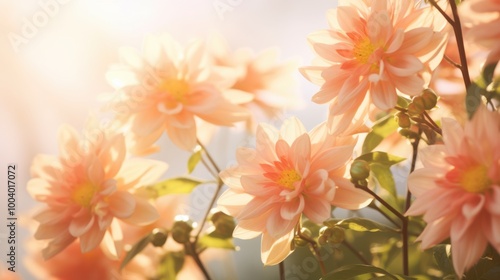 Peach-colored flowers in full bloom bask in gentle sunlight, their delicate petals glowing softly against a backdrop of green foliage.