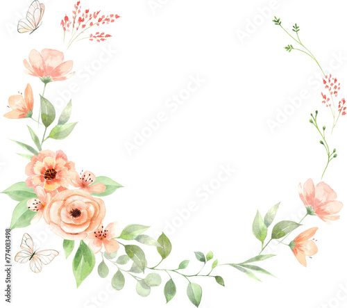 peach, peachy, watercolor, floral, chaplet, arrangement, frame, round, circle, nature, flower, bloom, blooming, blossom, delight, fuzz, decoration, illustration, elegant, hand-painted, pink, butterfly, orange, green, isolated, greeting, wedding, card, invitation, stationery, clip art, cute, trendy, poster, painting, art, design, bright, vibrant
