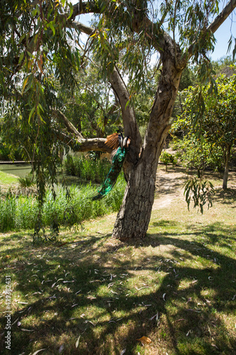 france, animal, arid, bird, blue, branch, camouflage, climbing, dry, enclosed, enclosure, environment, feather, graceful, green, heat, hot, natural, nature, outdoors, park, peacock, peak, plumage, preservation, safari, season, shade, spring, summer, tail, tree, weather, wild, wildlife