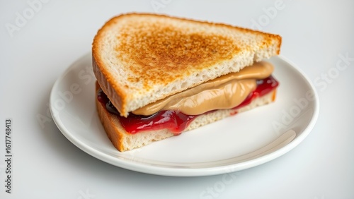 peanut butter and jelly sandwich cut diagonally on a white plate