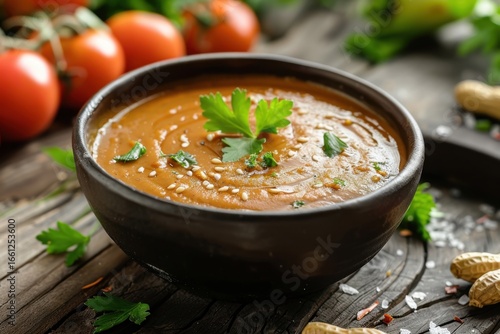 Peanut sauce served with fresh vegetables or noodles, food preparation