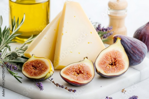 cheese, fig, rosemary, lavandula, olive oil, marble, board, still life, food, culinary, epicure, italian, mediterranean, healthy, fresh, snack, ingredient, dairy, aged, table, white background, rustic, elegant, aromatic, favor, texture, nourishment, delicious, sliced, wedge, arrangement, composition, photo, food photography, closeup, natural light, ripe, cut, portion, serving, meal, diet, gastronomy, traditional